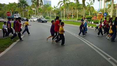 Melintas jalan raya dengan penuh berhati-hati. Jalan raya disekat oleh dua orang guru untuk tujuan keselamatan
